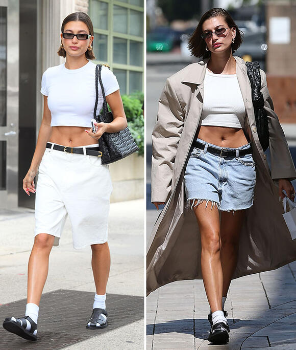 Hailey Bieber Wears A White Cropped T Shirt With Baggy Blue Jeans In West Hollywood